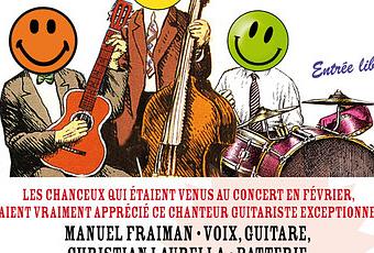 « Insolite Trio » en concert, avec Manuel Fraiman au chant et à la guitare, Bruno Morange à la contrebasse et Christian Laurella à la batterie (l'auteur du roman Sortie noire), le 27 avril 2015, de 19 h à 21 h à La table d'Émile, 7 rue Émile Zola - 93100 Montreuil. Réservation au 01 42 87 67 68.