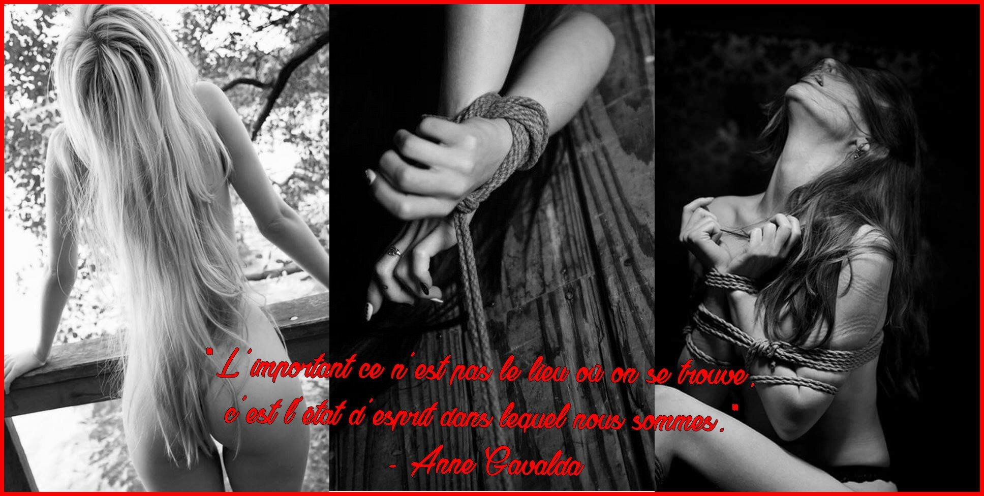"Elle se rêvait esclave d'antan, esclave éternelle, sans droit de parler, les yeux toujours baissés, agenouillée ou prosternée à ses pieds. Elle rêvait de chaînes, de fouet, de contraintes. Comment justifier l'excitation d'être asservie plus encore qu'un animal domestique, de vivre cloitrée, sans intimité, constamment aux ordres, humiliée, peut-être même frappée ?"