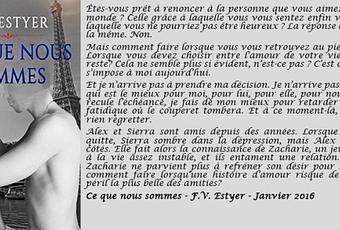 Un livre dont j'ai faillit passer à côté et je suis contente de ne pas l'avoir fait. Une histoire très différente de ce que j'ai l'habitude de lire. Une très belle histoire bouleversante et riche en sensations fortes.Une histoire avec non pas deux mais trois protagonistes. Une narration à trois voix qui ne vous laissera indifférent. " Ce que nous sommes " de F.V. Estyer est l'histoire de Sierra, Alex et Zach.