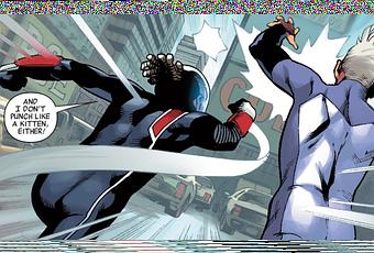 Pourtant, sous la plume de Robinson, le conflit passe mieux. Tout d'abord parce que le crime commis par l'Escadron ne peut rester impuni. Ensuite, parce que le scénariste joue à fond avec le côté "j'ai la plus grosse" qu'implique ce genre de combat. Ainsi, nous avons le droit à une course entre Quicksilver et Blur autant dynamique que drôle. En plus, Robinson écrit très bien Pietro - ce qui change de Duggan sur Uncanny Avengers - et le voir combattre le "speedster" de Squadron Supreme autant sur la vitesse que sur les punchlines est assez drôle.