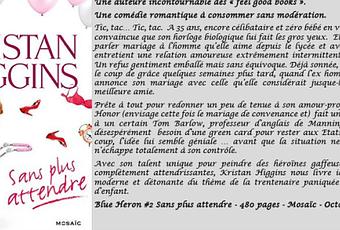 Je remercie les éditions Mosaïc pour l'envoi de ce service presse Kristan Higgins est une auteur incontournable pour moi et à ne pas manquer. On ne m'ennuie pas un seul instant avec ses romans et on passe toujours un excellent moment. Une suite que j'attendais avec une grande patience. Et encore une fois, je ne fus pas déçue de " Sans plus attendre " deuxième opus de la série Blue Heron.