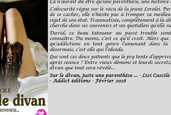 Une petite romance qui m'a beaucoup plu " Sur le divan, juste une parenthèse " de Lizi Cascile. Une auteur qui a beaucoup de potentiel et qui a su m'impressionner par son originalité. Des séances chez le psy pas comme les autres riches et intenses en émotions ....