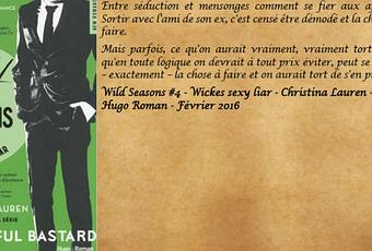 Je remercie Marie des éditions Hugo Roman pour l'envoi de ce service presse Quand on a dévoré les trois premiers opus d'une série Wild Seasons et que l'on en devient une grande Fan, notre plus grande crainte c'est d'être déçue par l'ultime tome. Mais si l'on connaît bien le phénoménal duo que forme Christina et Lauren, on sait que quoi qu'il arrive elles nous réservent un final inoubliable et haut en couleurs. Et ce fut encore le cas avec " Wicked sexy liar ".