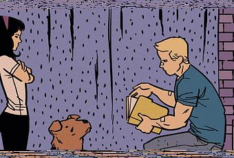 Jeff Lemire n'est pas à son premier archer. En effet, il a écrit Green Arrow pour la concurrence. Il serait alors envisageable que le scénariste opte pour continuer les aventures de Oliver Queen en les transposant dans le Marvel Universe. Mais, Lemire ne choisit pas la facilité et il trouve en Hawkeye une tout autre dynamique et il entreprend alors une approche radicalement différente. Son idée n'est pas de défaire tout ce que Fraction a construit. Nous retrouvons ainsi Clint Barton mais aussi Kate Bishop et leur chien. Il emprunte aussi la tonalité avec des héros simples et tourne son histoire sur l'humain. Mais sans oublier de nous raconter une histoire - à vrai dire deux mais je reviendrais sur ce point plus bas - qui se construit au fur et à mesure et dans laquelle le lecteur accroche facilement.