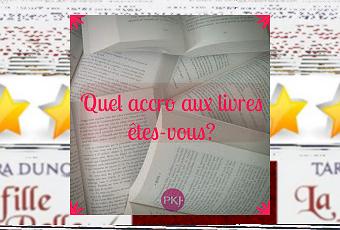 Résultats:Vous avez entre 1 et 8 points: Vous êtes un accro aux livres raisonnable! La plupart du temps, vous arrivez à maîtriser vos envies liées aux livres... enfin, la plupart du temps!Vous avez entre 9 à 17 points: Vous êtes un super accro aux livres! Les livres sont très importants pour vous, même...super importants! D'ailleurs, vous n'avez pas plus de temps à consacrer à ce test, parce que vous devez aller lire!Vous avez 18 points et plus: Vous êtes un accro aux livres de l'extrême! Lorsque cela concerne les livres, vous ne maîtrisez plus rien! Vous êtes absolument dépendant! Restez calme! Tout va bien se passer. Des nouveautés sont prévues cette semaine!Avec un total de 14 points, si j'ai bien compté, je suis une super accro aux livres ! Et vous ?