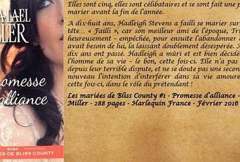 Je remercie Harlequin France pour l'envoi de ce service presse Une auteur que j'apprécie beaucoup dans la romance contemporaine. Linda Lael Miller. J'ai été curieuse de lire le premier opus de sa nouvelle Série Les mariées de Bliss County, " Promesse d'alliance ". Et bien que cela soit un bon moment de lecture, j'en ressors légèrement déçue.