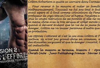 Je remercie les éditions Juno Publishing France pour l'envoi de ce service presse Deuxième opus de la série Quand la mission se termine de Christi Snow avec " Après l'effort " . Une suite qu'il me tardait de lire. Et encore une fois je ne fus pas déçue car l'auteur a mis la barre haute cette fois-ci ... Ici nous retrouvons l'aîné de la fratrie Robertson, Colton le maniaque du contrôle. Il a quitté l'armée pour retrouver et vivre avec les siens. Car depuis la mort de leurs parents, il a toujours pris soin de tout le monde. Mais parfois sa volonté à vouloir bien faire et surprotecteur a le don d'énerver son entourage. Et cette fois-ci c'est Chris qui en fait les frais depuis son retour après six mois de calvaire. Il est temps pour Colton de prendre des distances et de laisser les siens respirer un peu. Et entre en scène la surprenante et pétillante Penelope Pruitt qui va lui faire une proposition qu'il ne peut refuser. Mais de mystérieux évènements mettent Pénélope en danger ...