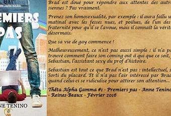 Je remercie les éditions Reines-Beaux pour l'envoi de ce service presse Un résumé attrayant. Une auteur que je découvre. Un début qui promet. " Premier pas ", premier opus de la série Thêta Alpha Gamma d'Anne Tenino. Tous les bons ingrédients sont réunis pour en faire un délicieux moment de lecture : Humour, Tendresse, Passion et Sensualité.