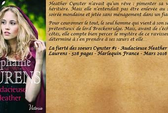 Je remercie Harlequin France pour l'envoi de ce service presse Premier opus de la trilogie La fierté des sœurs Cynster de Stephanie Laurens avec " Audacieuse Heather ". Un Historique comme je les aime avec de l'Aventure, du Complot, et beaucoup de Tension ...
