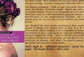 Je remercie les éditions Harlequin France pour l'envoi de ce service presse Retour avec le septième tome tant attendu de la série Hell's Eight de Sarah McCarty avec " Affolante obsession ". Encore une fois, nous retombons dans la Luxure la plus totale de Cowboys chauds comme la braise et ultra dominants. Et cette fois-ci place à Ace Parker qui va plaire à plus d'une ...