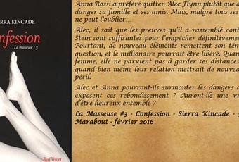 Je remercie les éditions Marabout pour l'envoi de ce service presse Suite et fin de la série La Masseuse de Sierra Kincade avec " Confession " . Un final à couper le souffle ! L'auteur a fait un excellent travail car je n'ai pas été déçue un seul instant ! On ne peut demander meilleure fin ...