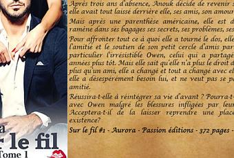 Une étonnante découverte. " Sur le fil " d'Aurora. Un premier opus à la fois assez frustrant mais également très intéressant. Après une absence de trois ans, Anouk est de retour en France. Elle espère renouer avec ses amis et en particulier avec Owen pour trouve une certaine stabilité sans pour autant tout dévoiler. Car Anouk est une experte en secrets ... Mais force est de constater que pendant cette période tout le monde a changé ainsi que les sentiments ...