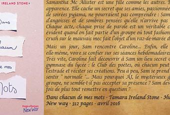 Je remercie les éditions Hugo Roman pour l'envoi de ce service presse Encore une autre petite pépite dans la collection New Way chez Hugo Roman. Un Young Adult très émouvant et unique dans son genre. " Dans chacun de mes mots " de Tamara Ireland Stone. Un livre qui aborde un sujet assez grave et qui touche beaucoup d'adolescents de nos jours : La Dépression, les troubles obsessionnels, Les crises d'angoisses. J'ai été curieuse de savoir comment l'auteur allait dépeindre l'intrigue du livre. Et je dois dire que j'ai été littéralement impressionnée. Elle a su choisir les mots qu'il faut pour montrer un aperçu à ceux qui n'ont jamais connu ce genre de trouble ainsi que les effets que cela peut avoir sur la personne qui en souffre et ceux qui l'entoure. Avec une plume fluide, prenante et remarquable, nous assistons à l'un des témoignages les plus bouleversants que l'on ait pu lire. Une intrigue magnifiquement construite intense en émotions avec un bon rythme et sans aucune longueur. Dès le début, on accroche à l'histoire et à ce qui arrive à notre héroïne. Les pages se tournent toutes seules sans que l'on puisse se détacher à la trame. Des moments intenses et tellement réalistes que l'on passe du sourire aux larmes, de l'inquiétude au bonheur.