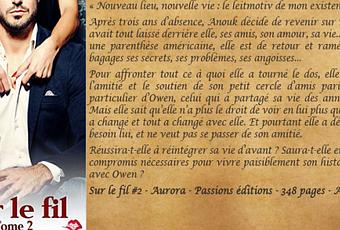 Je remercie Passions éditions pour l'envoi de ce service presse Deuxième opus de " Sur le fil " d'Aurora où nous retrouvons Anouk et Owen. Et comment vous dire ? Cette suite qui va mettre vos nerfs à fleur de peau. Une lecture où l'on ne saura plus sur quel pied danser tant le comportement de nos héros sont frustrants ... Retrouver Anouk et Owen fut éprouvant et épuisant ! Pourquoi ? Quand l'un est prêt à avancer l'autre recule et se braquer systématiquement et vis versa. Cette suite se reprend là où se termine la précédente. Anouk et Owen se retrouve et trouve un certain terrain d'entente pour la suite à venir. Mais tous ces secrets et ce manque de confiance pèsent sur le couple. Anouk et Owen se retrouvent devant une impasse ...