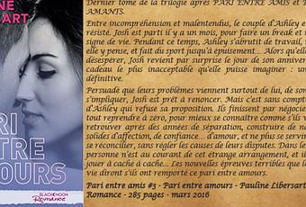 Dernier opus de la trilogie Pari entre amis avec " Pari entre Amours " de Pauline Libersart. Et je dois dire que c'est une grande surprise et c'est de loin mon tome préféré. Un final sous haute tension et riche en rebondissements ...Nous retrouvons Ashley et Josh, un mois après les événements. Et tenez-vous bien après cette ultime crise, le couple vont tout reprendre depuis le début avec de nouvelles bases. Un Pari où chacun va devoir faire beaucoup d'efforts et faire des compromis. Un Pari qui va prendre un nouveau tournant où chacun va enfin oser s'ouvrir un peu tout en se confiant à l'autre et où les barrières vont se briser. Et au moment où tout semble enfin aller pour le mieux le passé de Josh refait surface ...