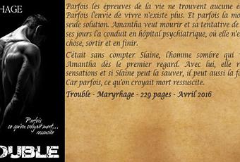 Je remercie Maryrhage pour ce service presse Une auteur que j'apprécie beaucoup. Un style particulier qui touche à chaque fois des sujets lourds et déroutants. Et bien que ses romans soient courts, Maryrhage a toujours su trouver les mots pour vous ébranler au plus haut point là où on s'y attend le moins. Et elle le prouve encore une fois avec son dernier roman. Une histoire qui porte à merveille son titre. " Trouble " c'est l'histoire de deux âmes brisées et torturées par leurs démons. Amantha, une jeune qui a perdu goût à la vie. Il a suffit que son chemin croise celui de Slaine dans ce lieu où elle est gardée prisonnière pour qu'elle ressente à nouveau ces sensations à jamais perdues. Une attraction mutuelle. Une relation interdite, trop risquée avec son lot de souffrance et de violence. Mais l'un pourrait être la bouée de sauvetage de l'autre et vice versa. Existe-t-il un Espoir pour que ce couple improbable puisse retrouver leur Liberté et connaître à nouveau le Bonheur ?