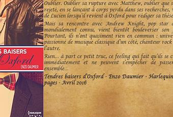 Je remercie Harlequin HQN pour ce service presse Une Sublime couverture qui a eu raison de moi. Un auteur au grand potentiel que je découvre. Car j'ai été littéralement conquise par ce petit roman typiquement British ... " Tendres baisers d'Oxford " d'Enzo Daumier. Nous allons suivre l'histoire de Lucien, jeune universitaire de retour à Oxford pour préparer sa thèse. Un retour doux-amer puisqu'après avoir fait son coming out auprès de sa famille aristocratique pour vivre pleinement sa relation avec son petit ami. Il se retrouve célibataire, le cœur brisé et renié par sa mère. Heureusement qu'il peut compter sur le soutien de ses meilleurs amis Nicholas et Ruby-Lou. Suite à un pari il va se retrouver dans une soirée et fera connaissance d'Andrew célèbre chanteur d'un groupe pop et frère de son meilleur ami. Une amitié qui va voir le jour. Une amitié va voir le jour pour laisser place à une certaines complicité qui va prendre un inattendu tournant ...