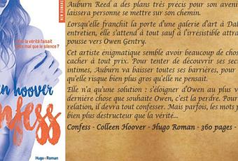 Je remercie les éditions Hugo Roman pour l'envoi de ce service presse Il ne fait aucun doute que Colleen Hoover est une Talentueuse Auteur. Quand on connait son univers et son style on sait immédiatement à quoi à s'attendre. À travers ses mots, elle arrive toujours à vous toucher en plein cœur. Elle possède ce don inné pour permettre aux lecteurs de créer un vrai lien émotionnel avec les protagonistes de ses romans. Et, elle le prouve encore une fois avec " Confess " qui est un petit Bijou éblouissant mais également poignant ... Des secrets, nous en avons tous. Certains peuvent être confiés tandis que d'autres on préfère les taire par peur d'affronter la réalité. De plus, exposer nos secrets, nos pensées, nos peurs ou nos cicatrices peut être intimidant voir gênant. Mais ne dit-on pas que se confier nous libère et nous aide à avancer ?