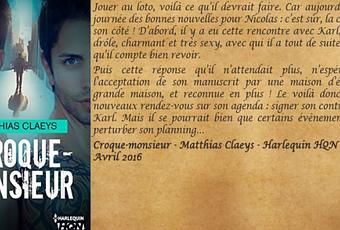 Je remercie les éditions Harlequin HQN pour ce service presse Un romantic suspens M/M atypique et fort surprenant. Un roman court avec un titre très étrange et qui vous laissera en même temps une curieuse impression. " Croque-monsieur " de Matthias Clayes. Un style singulier et très intéressant. Une intrigue bien ficelée voir même flippante et riche en rebondissements. Une narration très particulière en seulement quatre chapitres et qui fait son effet. Le point de vue des personnages clés (les deux protagonistes et deux personnages secondaires) de l'histoire.