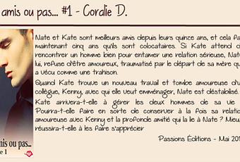 Je remercie Passions Éditions pour ce service presse Une agréable surprise pour ce premier opus de " Meilleurs amis ou pas... " de Coralie D. Une auteur qui a beaucoup de potentiel et qui a su se démarquer. Car bien que je ne sois une grande adepte des triangles amoureux, je dois dire que celui-là a tout pour plaire. Nate et Kate sont plus que des meilleurs amis. Ils se connaissent depuis leur enfance et vivent en colocation depuis plus de cinq ans. Ils partagent un lien spécial et fort. Mais il aura suffit d'un changement dans leur vie pour que tout bascule ...