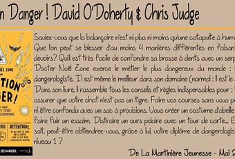 Je remercie les éditions De La Martinière Jeunesse pour ce service presse Un petit roman fort sympathique pour la Jeunesse 9-12 ans. " Attention danger " de David O'Doherty pour le texte et Chris Judge pour les illustrations. L'histoire suit un drôle de médecin, Docter Noël Zone qui nous enseigne d'une manière bien originale comment éviter les dangers de la vie ainsi que les mesures à prendre... Y'a pas à dire, notre Docter en a de la suite dans les idées entre les situations et les personnages tous aussi loufoques les uns que les autres. Entre comment savoir si on a une mamie robot ou pas, des requins qui volent au dessus des toilettes ou encore des vikings complètements fous, on n'a pas le temps de s'ennuyer.