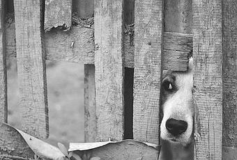 - Entre la rue et le chien, une porte fermée à clé. Heureusement un trou dans la palissade lui permet de se promener en dehors de son enclos.