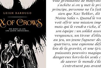 Au final, j'ai adoré. Les personnages sont attachants, j'ai ma petite préférence pour Kaz et Inej, on a des rebondissements, un univers sombre, une intrigue prenante, où se mêle vengeance, trahison, amitié... Vivement la suite car là, on reste vraiment sur notre faim, l'aventure est loin d'être finie...
