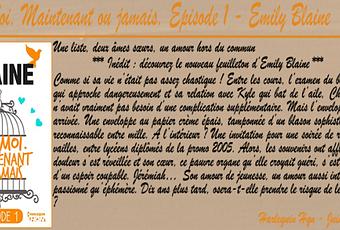 Je remercie Harlequin HQN pour ce service presse Une nouvelle romance pour Émily Blaine " Toi. Moi. Maintenant ou jamais " qui sera décomposée en 6 épisodes chez Harlequin HQN. L'intégral sera disponible en septembre dans la collection &H. Et voici mon petit conseil... alors si vous lisez l'épisode 1 (qui est gratuit) lisez dans la foulée l'épisode 2. Vous n'allez pas être déçues.