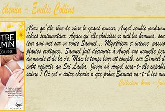 Je remercie Antoinette de chez &moi pour ce service presse Premier roman 100% ebook de la collection &moi avec " L'autre chemin " d'Émily Collins. Une petite romance qui fait du bien au moral et qui est à emporter avec vous dans votre liseuse pendant l'été... La rencontre d'une jeune femme qui a le don de choisir le mauvais mec, Angel et d'un écolo amoureux de la nature, Samuel. Tout a commencé par un défi pour prendre une tournure inattendue...