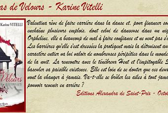 Je remercie l'auteur pour ce service presse Une agréable surprise pour ce New Adult contemporain. Une auteur que je découvre et qui a beaucoup de potentiel. Pourquoi ? Elle a su retenir mon attention. Je dois avouer que je ne m'attendais pas mais pas du tout à ce genre de lecture à laquelle j'ai accroché dès le début... " Mes pas de Velours " de Karine Vitelli. Une plume fluide, captivante et addictive. Une intrigue peu commune intense en sensations et riche en rebondissements qui est finement menée. Et je tiens à féliciter l'auteur pour son énorme travail pour ce décor impressionnant dans l'univers de la danse burlesque. Car on peut aisément se représenter les lieux et l'ambiance. C'est tout simplement incroyable. Un ton qui est donné dès le début.Un rythme transcendant où nos nerfs vont être mis à rude épreuve.