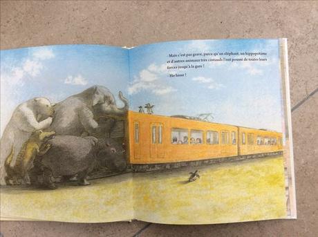 Peut-être que son train est en panne ? Et que plein d'animaux le poussent très très fort ?