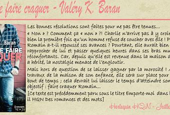 Je remercie Harlequin HQN pour ce service presse Une plume que je connais très bien dans la romance M/M et que j'apprécie énormément. Du coup, j'ai été curieuse de voir ce que l'auteur Valéry K. Baran allait me réserver dans la romance F/M avec " Pour te faire craquer ". Une nouvelle extraite du recueil de nouvelles publié lors du salon du livre 2016 chez les éditions Harlequin. À partir d'un idéogramme coréen, certains auteurs ont accepté de participer à un petit jeu littéraire. Écrire une petite romance s'inspirant de six idéogrammes : Amant, Voisin, Parapluie, Cahier, Soleil et Rêve. Et Valéry s'est vu attribuer le mot " Amant ". Et je dois dire que c'est une agréable surprise...