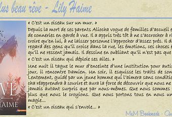 En bref, " Mon plus beau rêve " de Lily Haime est un Young Adult INCONTOURNABLE. Le titre et la couverture sont en symbiose avec l'histoire. Et enfin, cela nous montre bien qu'il na faut ne pas renoncer à son héritage, ne pas perdre espoir et qu'il faut toujours croire en l'Amour...