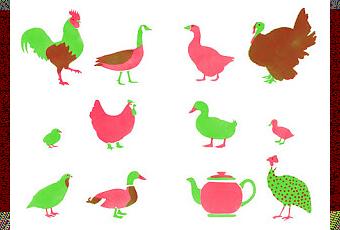 Sur papier crème, des pochoirs verts et roses, couleurs qui se superposent en brun parfois, composent un genre de planches naturalistes comme on voit dans les vieux dictionnaires ou aux cimaises des anciennes salles de classe: feuilles, fruits, animaux de la basse-cour, insectes,.. sont assortis par familles. En tout, trente très belles doubles pages s'offrent au regard dans leurs couleurs et leurs formes qui se déclinent remarquablement. Mais qu'on ne s'y laisse pas prendre: chacune d'elles recèle un intrus. Facile à identifier, parfois plus que les éléments des pages qui ne sont, heureusement, pas légendés. Au boulot, les lecteurs adultes! Ils pourront aussi aider à détacher les pochoirs fournis en fin de cet album aussi rigolo qu'esthétique. Un travail très intéressant sur les formes et les sens que ne laisse pas nécessairement deviner la couverture.