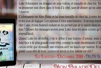 Une plume que je connais très bien que j'apprécie beaucoup. Et cette fois-ci Eli Easton nous offre une nouvelle unique dans son genre...