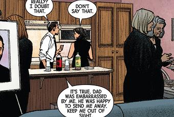 La discussion entre Marc et sa mère, au soir de l'enterrement du père, est d'ailleurs assez dérangeante. Un échange turbulent a lieu, Marc insistant que son père l'avait éloigné par pure honte de sa schizophrénie, tout de suite rétorqué par la mère soulignant l'amour et l'inquiétude de ce dernier à l'égard de son fils. Marc semble alors bizarrement déconnecté, puis déclare avec un ton inquiétant "Marc n'est plus là, Jake est maintenant présent". Madame Spector, gênée par la manifestation de sa maladie, supplie Marc de stopper ce cirque. Celui-ci reprend connaissance, s'excuse et file se rafraîchir les esprits. On a l'habitude de voir Moon Knight annoncer une transition de personnalité à ses collègues, comme au détective Flint, mais voir le changement brusque apparaître dans ce moment inadéquat est assez gênant à assister. Jeff Lemire offre donc une scène génialement perturbante, révélant notamment des indices sur les liens entre membres de la famille Spector. Ce qu'on peut retenir est que le jeune homme éprouvait beaucoup de rancœur envers son père, alors que le numéro précédent témoignait des gestes attentionnés de ce dernier, tournés davantage vers le soin que le rejet.