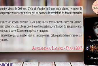 " L'appel de ton sang " est une très belle découverte avec le parfait mélange d'Actions, de Danger, de Suspens, de Mystère, de Tension, de Rebondissements, d'Humour, de Passion, de Sensualité et d'Émotions. Tout ce qu'il faut pour passer un excellent moment. Alexandra Lanoix a fait un super boulot en nous laissant ce très beau message. Je dois bien l'avouer que cette nouvelle facette de son univers m'a beaucoup plu. Et avec cet imprévu final que je n'ai pas vu venir, je ressors de ma lecture littéralement stupéfaite...