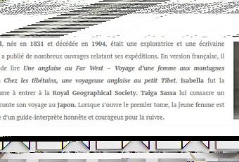Pour rejoindre Niigata, première étape de son périple, Isabella Bird a choisi une voie secondaire, rarement empruntée par les voyageurs étrangers. Au fur et à mesure que l’intrépide exploratrice s’enfonce dans la campagne japonaise, l’agitation des grandes villes et la splendeur des sites historiques s’effacent devant la misère du monde rural… Aux divers chocs culturels s’ajoutent des conditions de voyage de plus en plus difficiles, si bien qu’Ito lui-même a du mal à faire face à cet aspect de son pays qu’il ignorait. Mais l’aventurière refuse de se laisser abattre, et c’est sans fléchir qu’elle s’engage sur le dernier tronçon de la route d’Aizu !