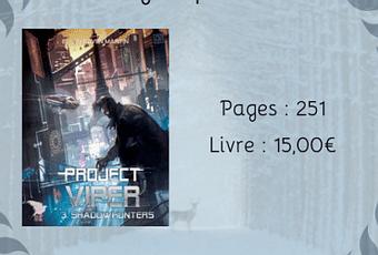 Ellen Raven Martin" /> Ellen Raven Martin" title="Project Viper #3 – Shadowhunters > Ellen Raven Martin" />Le jeu continue. L'Augure a filé et a un nouvel objectif dont la vengeance d'un ami est la façade. Successeur de Victor Winslow, mort par sa seule bêtise, l'Augure décide de sacrifier sa société pour faire chuter le Conglomérat. Pour l'arrêter, les Vipers doivent s'unir malgré leurs blessures. Quand Aryan Turner lui-même tombe malade du fait d'une neurophine défectueuse, le ton est donné. L'Augure a-t-il vraiment comme seul but de créer un scandale sanitaire ? L'affaire mènera la fraternité dans une France fracturée, un territoire dévasté par la guerre, à la recherche d'une ombre. Dans le clair-obscur des lumières de la tour Eiffel se fomentent intrigues et attentats. Les Vipers sauront-ils tous les déjouer ?