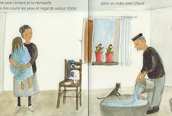 Sur doubles pages, les aquarelles toutes simples de l'auteure-illustratrice belge (plus de 200 livres à son actif, lire ici) disent un épisode de vie touchant. Joliment cadrées, réalistes, explicites, elles font avancer le récit, lui donnent de la profondeur, de l'humain. Le lendemain d'une tempête, un couple grec âgé découvre une forme sur le rivage en face de sa maison. C'est une petite fille, trempée, frigorifiée, légèrement blessée. Alexi la ramasse, la prend dans ses bras, la ramène. Héléni la baigne, la soigne, la réconforte. Le lendemain, Amina a un peu récupéré. Elle mange, sort au jardin, se souvient qu'elle est tombée d'un bateau.