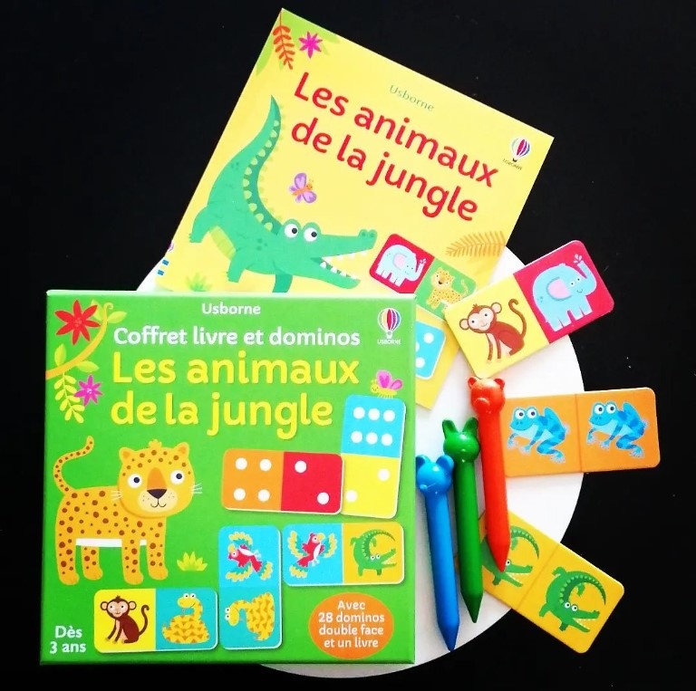 Etes vous prêt à découvrir le thème des animaux avec le nouveau coffret jeux et livre, on va apprendre à connaître et reconnaître 36 animaux. Regroupés sur 4 planches, on trouve 9 dessins d'animaux divers et variés par planche. Un livret reprenant toutes les figures des 36 cartes, donne des informations sur le nom, les habitudes de vies ou les particularités de chaque figure. On peut commencer à jouer tout seul ou à plusieurs en suivant les règles du jeu proposées. On trouve un jeu de mémoire, style Memory et un autre de loto. De quoi passer un bon moment, en apprenant là reconnaître la diversité des animaux qui peuplent la terre. Les dessins sont colorés et joyeux. Deux jeux en un pour découvrir les animaux. Un jeu parfait à emporter avec soi et à faire suivre pour les vacances où les mercredis pluvieux. Conçus pour les enfants dès l’âge de 3 ans, pour 2 à 5 joueurs. Pour les plus petits, on peut aussi faire plus simple et leur proposer de poser la carte qui correspond à la même image que sur la planche, c’est déjà un bon exercice. A la maison, les petits s’intéressent aux images et à ce que cela représente, je peux ensuite leur lire la description faite dans le livret. Un dernier détail qui a son importance, la boite qui le contient est solide et résistera à de nombreuses manipulations. Un coffret de jeux pour des moments amusants en famille ou entre amis.