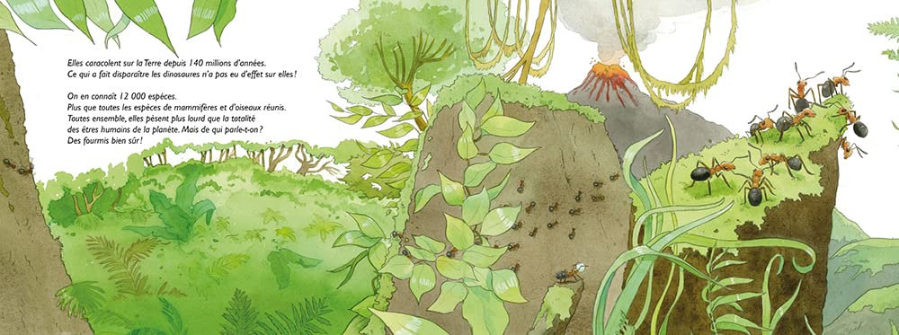 Ma chronique :Peut-on imaginer qu'il y ait autant de fourmis sur terre ? Plus de 14000 espèces. Quelles soient présentent depuis si longtemps, 140 millions d'années et qu'elles seront là encore bien longtemps après nous. Les fourmis possèdent de nombreuses qualités, elles sont rapides, très organisées, ont une bonne mémoire, elles sont fortes et peuvent porter plusieurs fois leur poids. Elles savent s'adapter à leur milieux et parfois, leur corps aussi se différencie en fonction de leur travail. On trouve ainsi des fourmis soldats aux mandibules impressionnantes. Il y a tellement de choses à apprendre sur elles, que la science des fourmis se nomme la Myrmécologie. En ouvrant les pages de ce merveilleux album vous allez pouvoir être initié au monde souterrains des fourmis. J'ai trouvé cet ouvrage passionnant. De nombreuses espèces sont représentées avec leur noms scientifiques, l'endroit où on peut les trouver sur la planète et en se fiant aux illustrations d’Émilie Vanvolsen, on peut se faire une idée exacte de ce à quoi elles ressemblent. Le monde de ces insectes sociaux n'auront bientôt plus de secrets pour vous grâce au talent d'éthologue de Fleur Daugey. Les deux dernières pages « En complément » donnent des informations plus pointues et viennent parachever nos connaissance sur le sujet. Entrer dans la fourmilière se révèle un voyage inoubliable, les fourmis sont fourmidables ! Bonne lecture.